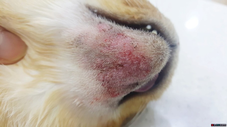 1) 턱과 입 주위에 붉은색 또는 분홍색의 뾰루지 또는 여드름이 생깁니다.