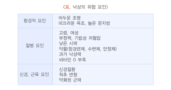 낙상은 골절 발생의 중요한 원인이 됩니다. 낙상의 위험요소는 환경을 개선하는 것이 아주 중요합니다. 뿐만 아니라 낙상이 발생하기 쉬운 질병을 가지고 있는 경우에도 주의가 필요합니다.