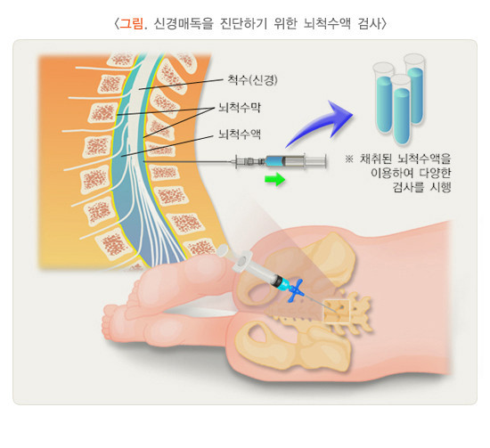- 뇌척수액 내 포도당, 단백질, 백혈구, 적혈구, 감마글로불린의 양 측정