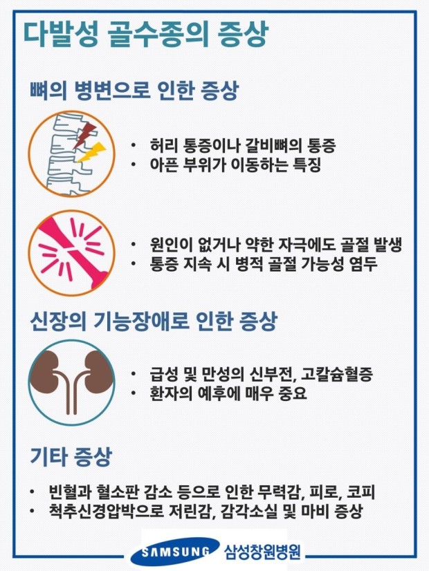 다발성골수종은 골수에서 형성되는 형질세포가 비정상적으로 증식해 뼈를 파괴하는 혈액암입니다. 형질세포는 우리 몸의 면역체계의 일부로, 항체를 생성하는 역할을 하게 됩니다. 다발성골수종이 발생하면 형질세포가 비정상적으로 증식해 뼈를 파괴하고, 신장 기능에 이상을 유발하고, 혈액 내 칼슘 수치가 높아지는 등의 증상을 유발하게 됩니다.