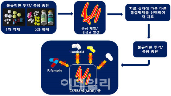 결핵균이 항결핵제에 노출되어 내성을 각제 된 것입니다. 항결핵제를 제대로 복용하지 않거나, 치료를 중단하는 경우 다재내성 결핵균이 발생할 수 있습니다.
