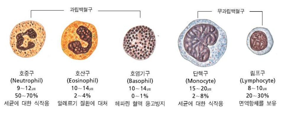 백혈구는 크기 두 분류로 나뉘는데, 백혈구 세포 내에 과립이 있는 과립구와 과립이 들어 있지 않은 무과립구가 있습니다.