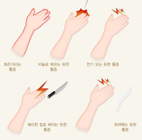 외상이나 수술 부위에 지속적인 통증이 나타나며, 통증은 가만히 있어도 느껴지고, 움직이면 더 심해집니다. 통증의 형태는 저리거나, 화끈거리는 등 다양한 양상으로 나타납니다.