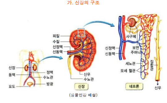 1) 여과 : 혈액이 신장의 사구체라는 작은 혈관 뭉치를 통과하면서 물, 포도당, 무기염류, 요소 등이 혈관 밖으로 걸러집니다. 이렇게 걸러진 액체를 원뇨라고 합니다.