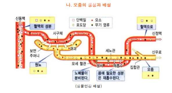 2) 요소 : 단백질 대사 과정에서 생성되는 노폐물로, 신장에서 걸러져 소변으로 배출됩니다.
