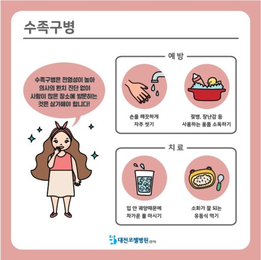 수족구를 예방하기 위해서는 손을 자주 씻고, 환자와의 접촉을 피해야 합니다. 환자가 사용한 물건을 만지지 말고, 환자가 기침이나 재채기를 할 때는 입과 코를 가려주거나 마스크를 착용합니다.