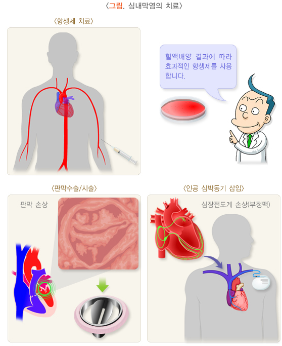 1) 감염성 심내막염 : 항생제 치료를 통해 감염을 치료합니다. 항생제의 종류와 투여 기간은 환자의 상태에 따라 달라집니다.