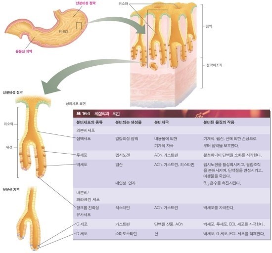 벽세포는 단백질을 분해할 수 있도록 도와주는데, 펩시노겐이 펩신이 될 수 있게 도와주는 염산과 소장에서 비타민 B12의 흡수에 필요한 내인인자를 분비합니다.