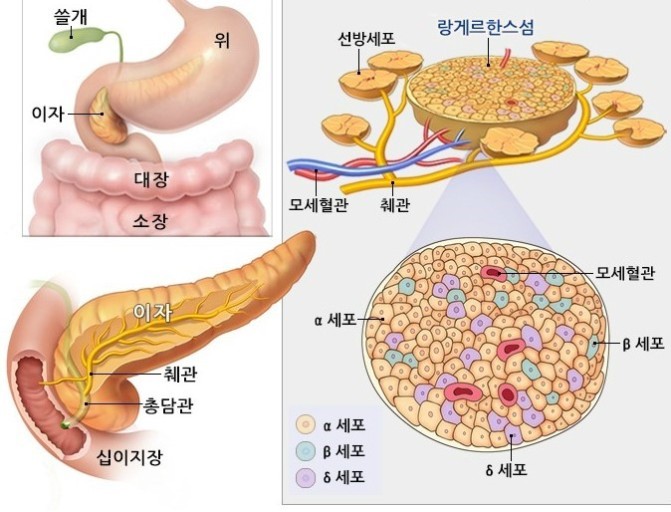 내분비 조직으로는 이자섬, 즉 랑게르한스섬이라 불리는 세포가 산발적으로 흩어져 아주 작은 섬을 이루고 있습니다. 이자섬은 이자의 약 2~3% 정도를 차지하고 있습니다.