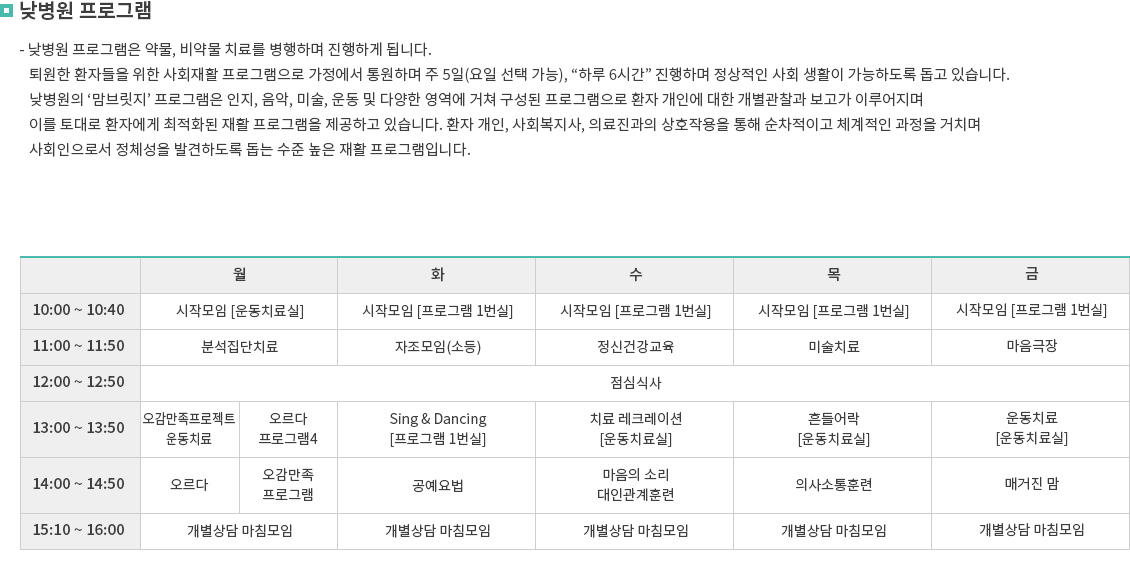부분입원 형태라고 생각하시면 되고 병원에 입원되어 있는 환자들이 집중적인 재활치료를 받기 위해 이용하는 경우가 많습니다. 그리고 집에서 거주하면서 오전에 낮병동 왔다가 프로그램 다 받고 오후에 집으로 돌아가는 환자들도 있습니다. 프로그램 종류가 많고 이용료는 병원마다 다르지만 유료입니다.