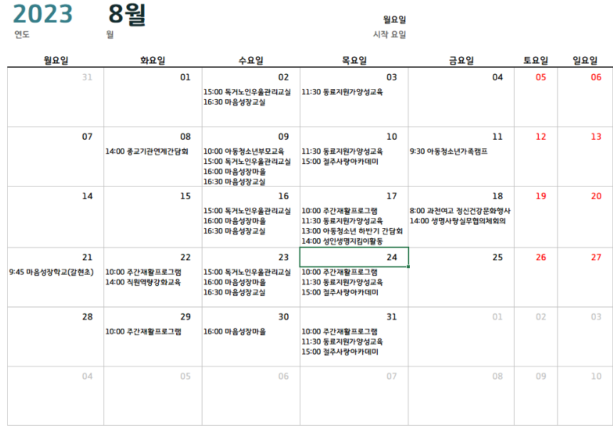 아래 일정표는 주간재활프로그램이라고 적혀 있는 날짜에만 재활프로그램을 운영하는 것입니다. 과천시 정신건강복지센터의 경우에는 주 2일 운영하고 있다고 보면 됩니다.
