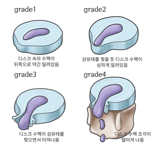추간판 탈출증(lumbar herniated intervertebral disc) 척추뼈와 뼈 사이에 있는 추간판이 어지면서 내부의 수핵이 밀려 나오는 질환입니다. 추간판은 척추뼈 사이에서 충격을 흡수하고 척추의 유연성을 유지하는 역할을 하는데, 추간판이 찢어지면 수핵이 밖으로 밀려 나와 척수 신경을 압박하거나 자극해 통증, 감각 이상, 운동 장애 등의 증상을 초래하게 됩니다.