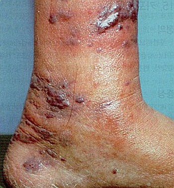 1) 피부에 발생하는 붉은색, 자주색, 갈색의 반점이나 결절이 다리, 몸통, 팔, 얼굴, 점막에 발생할 수 있습니다.