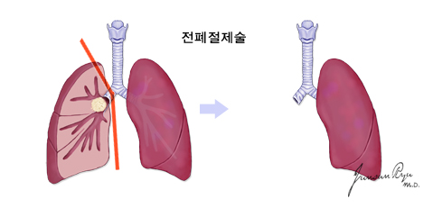 한쪽 폐를 전부 제거하 수술법으로 절제하는 폐의 용적이 크기 때문에 수술 전에 심폐기능에 관련된 평가를 받아서 절제 후에 있을 심폐기능이 적절한 환자에게 적용됩니다.