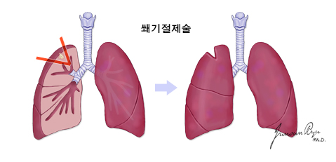쐐기절제술은 종양과 그 주변 작은 범위의 조직을 쐐기 모양으로 절제하는 수술이고, 병변이 폐의 말초부위에 위치할 때 실시합니다. 분절절제술은 엽절제술보다 더 작은 용적의 폐를 절제하는 것으로 쐐기절제술보다 더 중심부에 있는 병변을 절제하는 수술법입니다.
