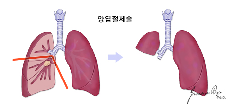 오른쪽 폐는 상엽, 중엽, 하엽으로, 왼쪽 폐는 상엽과 하엽으로 구분되어 있습니다. 폐엽은 엽마다 각각의 폐동맥, 폐정맥, 엽기관지로 이루어진 단위이기 때문에 이중에서 하나의 폐엽을 제거하는 수술방법입니다. 암종이 해당 폐엽에 국한되어 있을 때 실시합니다.