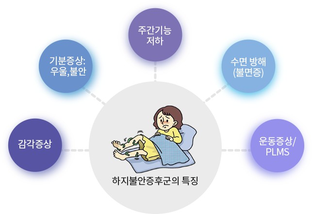 2) 다리를 움직이고 싶은 충동 : 다리를 움직이지 않으면 증상이 악화되기 때문에, 잠자리에 들거나 앉아 있을 때 다리를 움직이고 싶은 충동이 생깁니다.