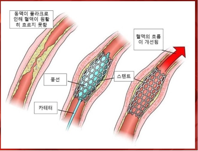 2) 수술치료 : 혈관을 넓히거나 혈류를 개선하여 심장에 충분한 혈액과 산소가 공급되도록 합니다. 스텐트 삽입술, 관상동맥우회로수술 등이 시행될 수 있습니다.