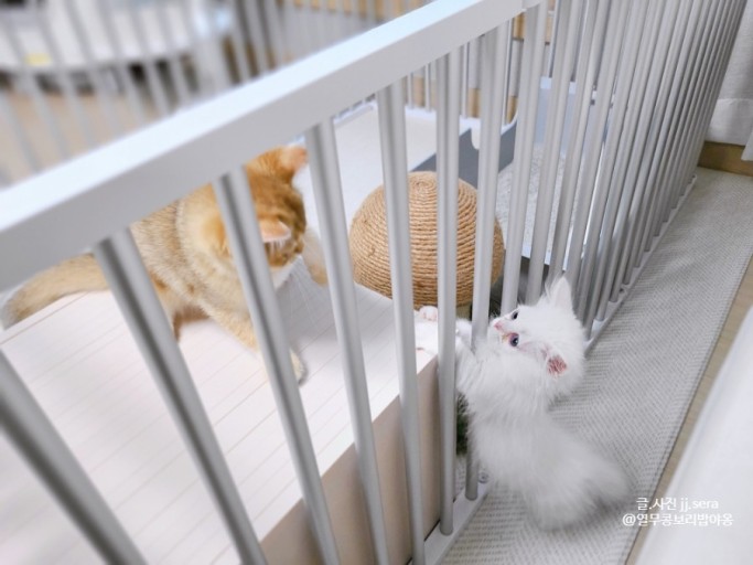 새로운 고양이가 기존의 고양이 냄새에 적응을 했다면, 두 마리 고양이를 천천히 접촉 시킵니다. 그물망이나 격리시키는 울타리(팬스)를 만들어 서로의 존재를 인식하게 합니다.