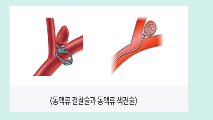뇌동맥류 코일 색전술은 뇌동맥류에 코일을 삽입해 출혈을 막는 수술입니다. 혈관 카테터를 통해 뇌동맥류에 코일을 삽입하여, 코일로 뇌동맥류를 막습니다. 뇌동맥류 코일 색전술은 뇌동맥류 결찰술에 비해 수술 시간이 짧고, 회복이 빠른 장점이 있습니다.