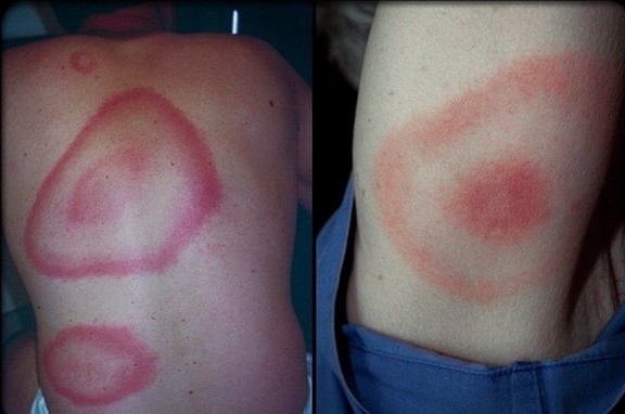 피부 발진이 나타나는데, 진드기에 물린 부위에 붉은색 반점이 나타나며, 점차 커지면서 빨간 동심원을 형성합니다. 이런 식의 홍반은 모든 라임병 환자에게 나타나는 것은 아니며, 약 75%의 환자에게서 나타납니다.