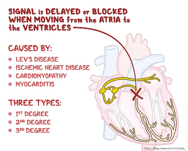 방실차단은 심방과 심실 사이의 전기 신호 전달 장애로 인해 심박수가 느려지는 질환입니다. 방실차단의 정도는 심방에서 심실로 전달되는 전기 신호가 얼마나 차단되었는지에 따라 1도, 2도, 3도로 나뉩니다.