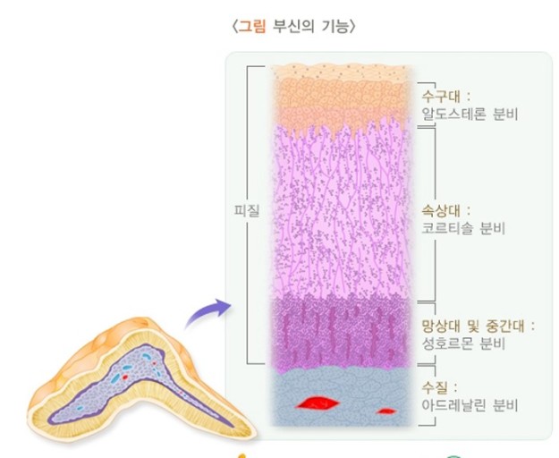 부신겉질과 부신속질에서 분비되는 호르몬 종류별 기능