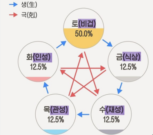 2) 상극 : 목극토, 토극수, 수극화, 화극금, 금극목