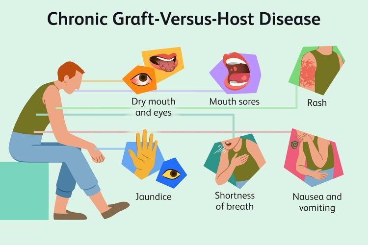 이식편대숙주병의 증상은 이식받은 공여자의 세포가 공격한 기관에 따라 다릅니다. 일반적으로 피부, 간, 위장관, 소화관, 폐, 눈, 뇌 등이 공격받을 수 있습니다.