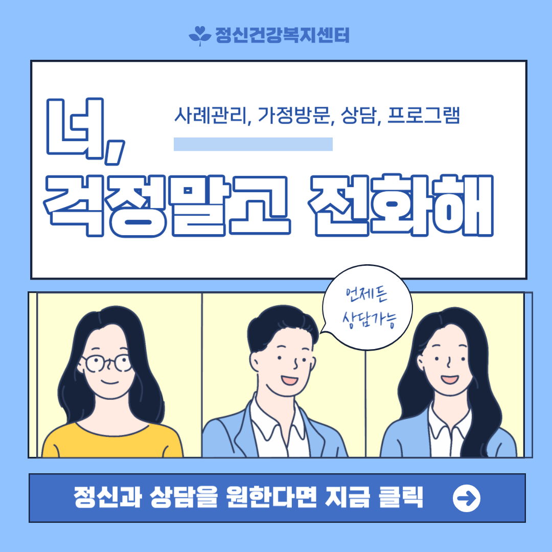 시, 군, 구에 위치하고 있는 정신건강복지센터에서 무료로 전화상담, 내소상담, 사이버상담이 가능하고, 각종 프로그램을 이용할 수 있습니다.