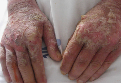 1) 피부염 : 햇빛에 노출된 부위에 붉고 거친 피부 발진이 나타난다. 특히 얼굴, 목, 손 등이 심하게 붉어지고, 심한 경우에는 물집이 생기거나 피부가 벗겨지기도 한다.