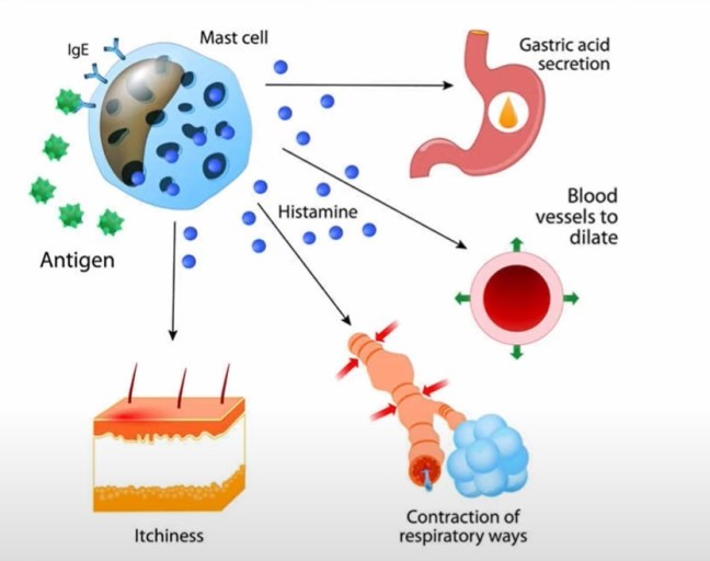 알레르기 반응은 외부에서 들어온 항원에 의해 과도한 면역 반응이 일어나는 것입니다. 알레르기 반응은 우리 몸을 보호하기 위한 면역 시스템의 한 부분이지만, 때로는 심각한 문제를 일으킬 수도 있습니다. 1. 알레르기 발생 기전 1) 항원과의 첫 번째 접촉 알레르기 반응이 처음 발생하는 경우, 항원을 처음 접촉하게 됩니다. 이때 우리 몸의 면역 세포인 비만세포가 항원을 인식하고, IgE 항체를 생성합니다. IgE 항체는 비만세포의 표면에 결합하게 됩니다. 2) 항원의 재접촉 항원을 한 번 이상 접촉한 후, 다시 항원에 노출되면, 비만세포의 표면에 결합된 IgE 항체가 항원을 인식합니다. 이때 비만세포는 히스타민, 류코트리엔, 프로스타글란딘 등의 알레르기 매개 물질을 분비합니다. 3) 알레르기 증상의 발생 알..